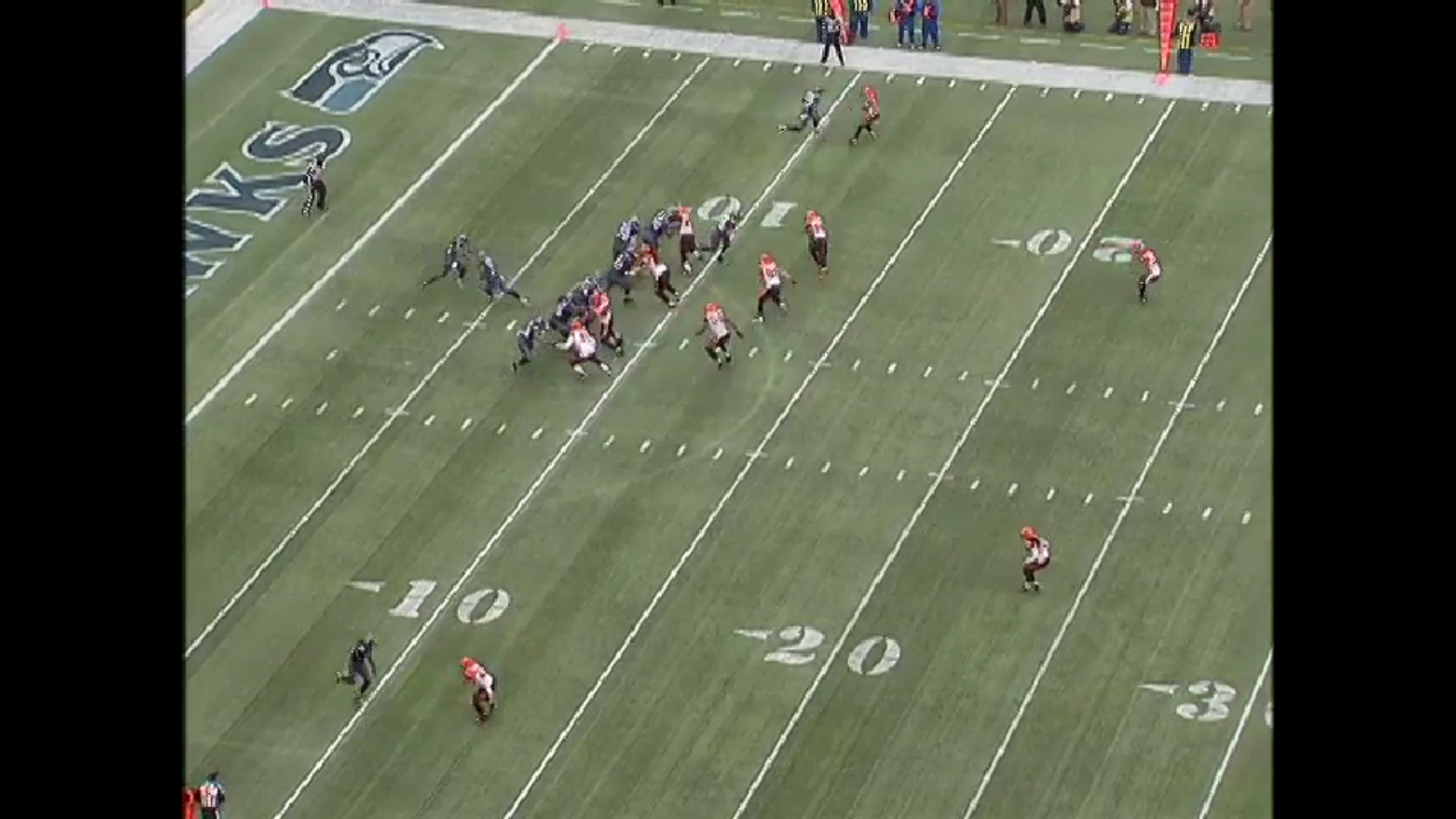 FIRST READ: Jackson’s first read is to his favorite receiver, Sidney Rice. Rice did not get a clean release off the line, and the Bengals safety clearly is giving help over the top. This should be a red flag to Jackson, screaming “don’t throw it here!” Note the massive pocket formed by the offensive line. That is why you keep hearing the line is progressing.