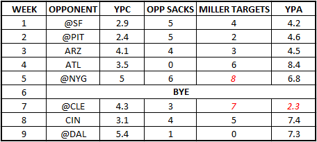 I have updated that table with the last four games. Note, the items in red indicate something different about that stat for that week. For example, Miller was injured early in the NYG game and did not play against CLE. Similarly, Tarvaris Jackson did not play against CLE, which is noteworthy for YPA. For the games Zack Miller missed, I substituted targets for the other tight ends, Anthony McCoy and Cameron Morrah because that still indicates tight ends were out in patterns instead of blocking.