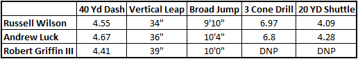 People can argue that these measurements don’t matter for quarterbacks, but they would be wrong. Players like Luck, RG3, and Cam Newton are taken at the top of the draft precisely because they combine athletic talent with quarterback skills. Ask Ryan Mallett if just displaying elite passing ability is enough. Wilson doesn’t lack for quarterbacking talent either.