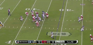 Wilson stares down a blitz by the Cardinals on 3rd and 8, and scrambles to his right before throwing what looks like a desperation heave that finds the hands of Rice again for a first down, that eventually led to points for Seattle.