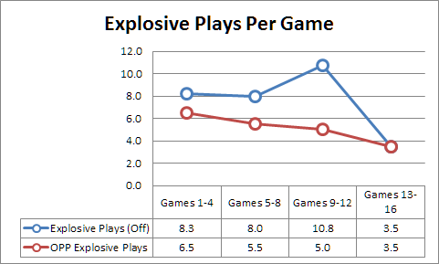 Those explosive plays have all but disappeared the past three weeks. The play-calling has appeared desperate at times to create those explosive plays instead of earning them with smaller gains on the ground and through more conservative pass plays. There have been fewer stop routes, slants, crossing patterns and screens. These plays will not usually net big yardage, but they can mean the difference between 2nd and 10 and 2nd and 6.