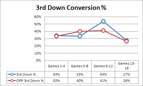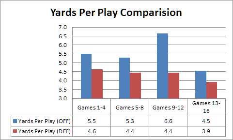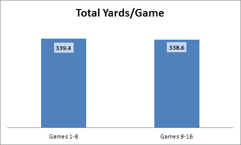 It is worth noting that while we dislike seeing the downward trend in the offense over four games, the trend becomes much less legible when the season is divided in two. The team averaged 25.6 ppg in the first eight games of the year and 26.5 in the last eight. They averaged 339.4 yards per game in the first eight, and 338.6 in the last eight. Those numbers suggest that the offense has not really grown or regressed much over the course of the season. They had ups and downs, but the overall body of work is pretty darn consistent.