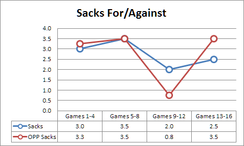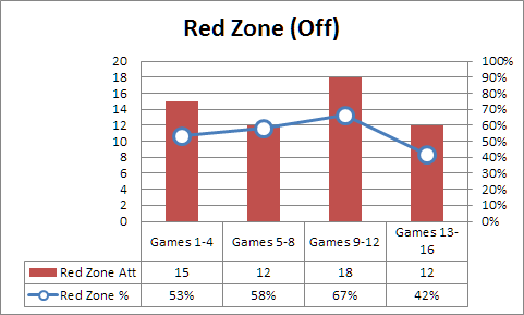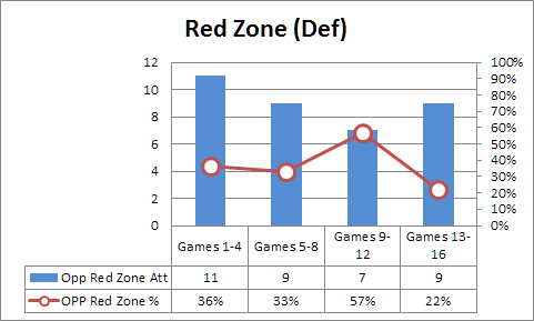 This is downright stingy stuff. One word of caution is the big uptick in takeaways the last four games. Takeaways are unpredictable, and while they can be influenced by a defense, it is not something they can control. A fair number of those takeaways came in the opponent end zone. Assuming that will continue is playing with fire.