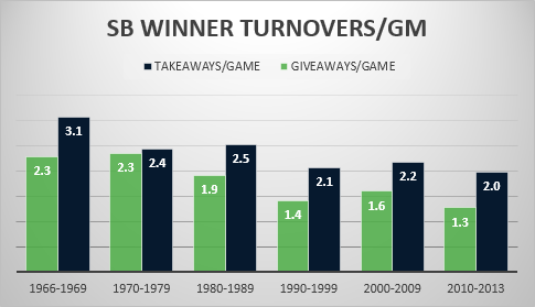 Some things never change. Taking the ball from your opponent more than he takes it from you is still a key part of winning it all. The absolute number of takeaways and giveaways have changed a bit over time, but the spread between the two numbers is a pretty steady +0.7 per game. That works out to a +11 turnover ratio in a 16-game season. If you want to win a Super Bowl, you better get to a +10 turnover margin.