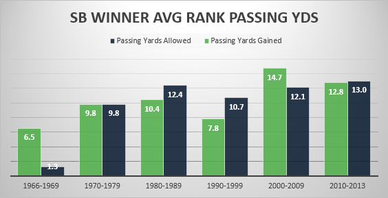 Even a Seahawks team that averaged just 202 passing yard per game could not pull down the average that much for the current decades winners. Champions are averaging a whopping 247.4 passing yards per game the last four years, which is 20 yards more than in any other decade. Not surprisingly, winning defenses are allowing more passing yards as well.