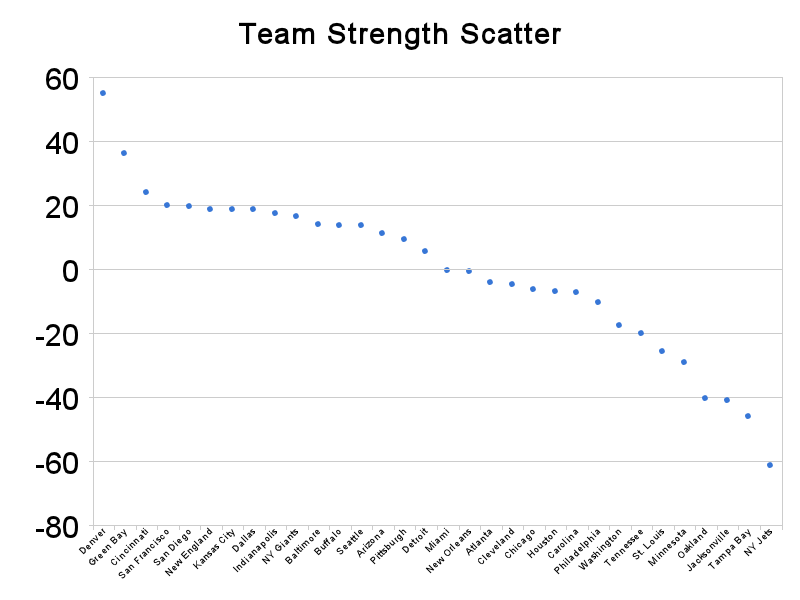 Detroit looks like another pretender with a very poor SOS and small point differential. Watch out for the Saints, who are showing signs of life. Their game against the 49ers in a few weeks will be telling. Four of the Seahawks remaining nine games are against teams ranked ahead of them, while six of nine are against top fifteen clubs. Those choosing to place a bet on these games will certainly have to do their fair share of research. The bunching of teams, as shown in the scatter chart below, is unlike most other seasons. The difference between #4 and #13 is very slight.