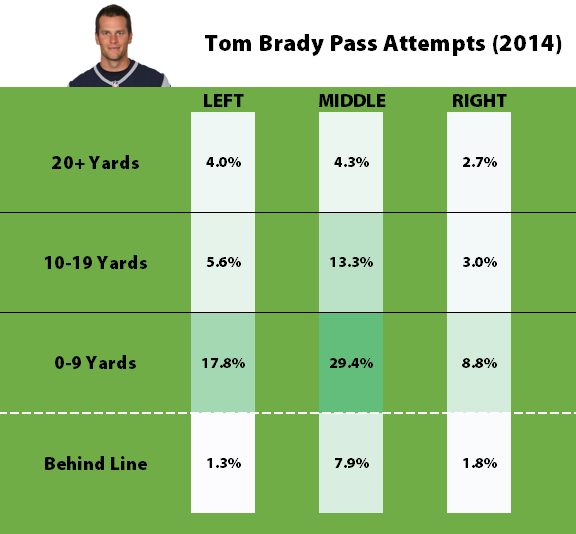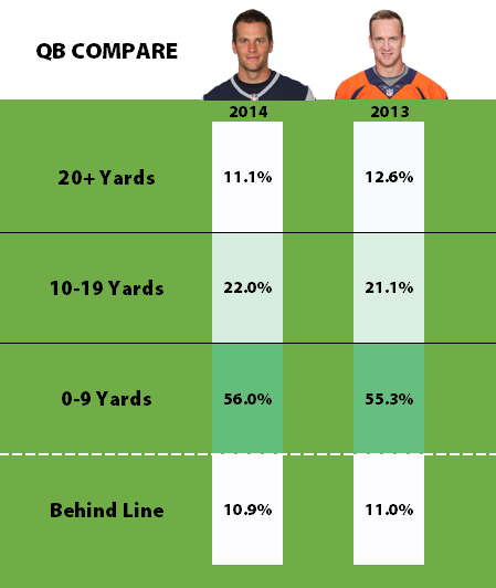 Brady from this year is almost a carbon copy of Manning from last year in terms of depth of throw. He actually throws deep a little less than Manning did. The similarities do not end there.