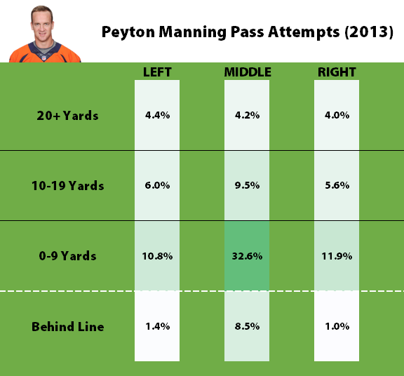 Manning was heavily reliant on crossing patterns and pick plays over the middle of the field. His tight end, Julius Thomas, was a revelation last year and he was complimented by super slot receiver Wes Welker. Those tendencies show up when looking at Manning’s pass attempts.