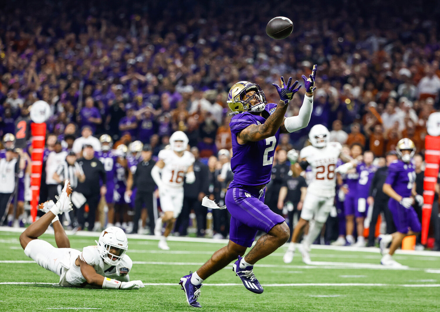 The tipped pass falls into the hands of Washington's Ja'Lynn Polk who scores in the second quarter to give the Huskies a short-lived 21-14 lead over Texas. The second-ranked University of Washington Huskies played the third-ranked Texas Longhorns in the Sugar Bowl, the semifinal game of the College Football Playoffs, Monday, Jan. 1, 2024, at the Superdome, in New Orleans, Louisiana. (Dean Rutz/The Seattle Times/TNS)