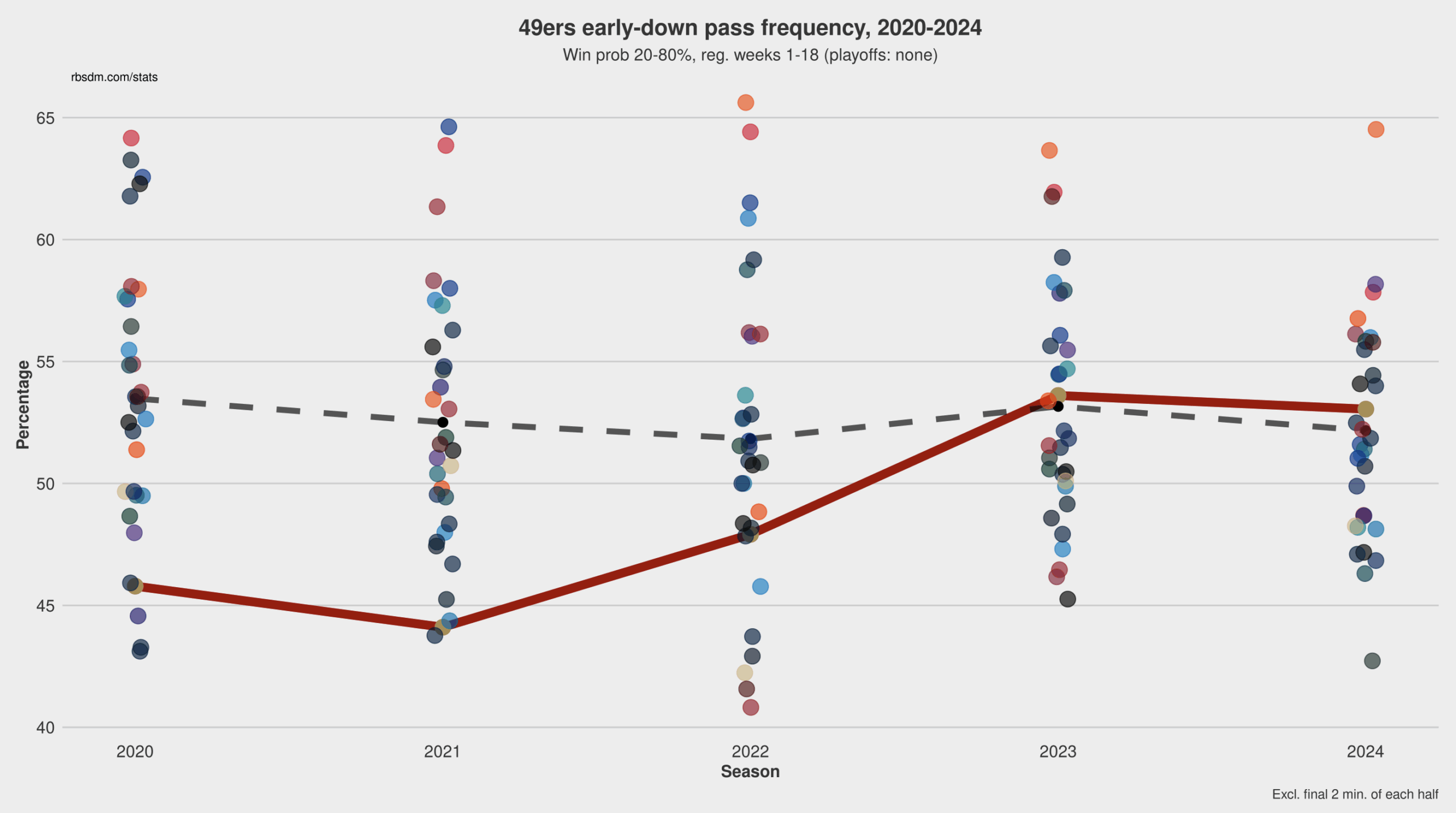 Kyle Shanahan went from 31st in the NFL in early down passing to 13th. This was not just a one season aberration during a down season when the team was trailing more often. The data pictured above (from rbsdm.com) removes situations where teams would be more inclined to pass due to game script (e.g., losing by a lot, last two mins of a half, etc.). And the picture below shows the trend did not start last season.