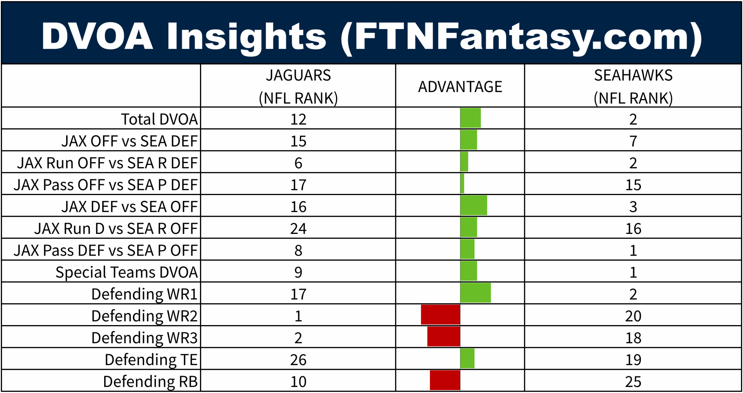 Tale of the Tape features DVOA data, courtesy of FTNFantasy.com. If you remember the great Football Outsiders site that used to publish DVOA rankings, you should know that data has moved to FTNFantasy. The table below shows how the two teams match up from a DVOA perspective.