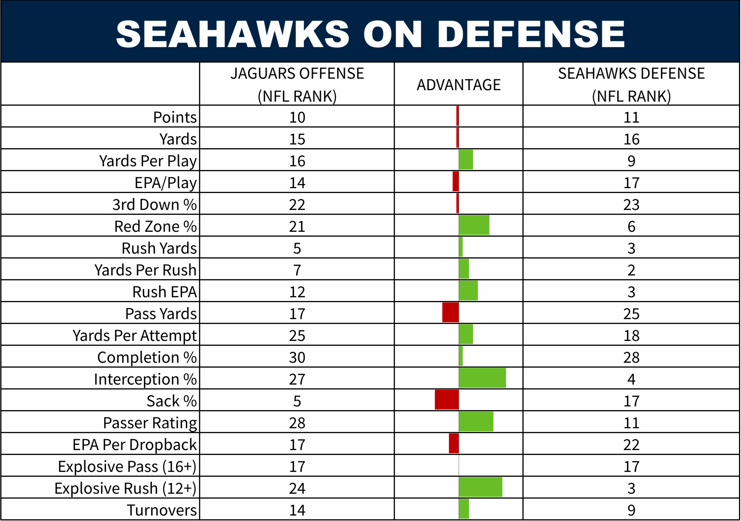 Seattle has a massive advantage in yards per play. The takeaways for the Jags are hiding some weakness in that defense. They are 16th in success rate, meaning offenses are moving the ball effectively when they are not turning the ball over. A good illustration of just how much takeaways are hiding flaws is the Jags ranking 3rd in EPA per dropback on defense, but 21st in success rate per dropback. EPA is highly impacted by turnovers. Success rate is not. All that to say, protect the football, and this efficient Seahawks offense should be able to score on this team.
