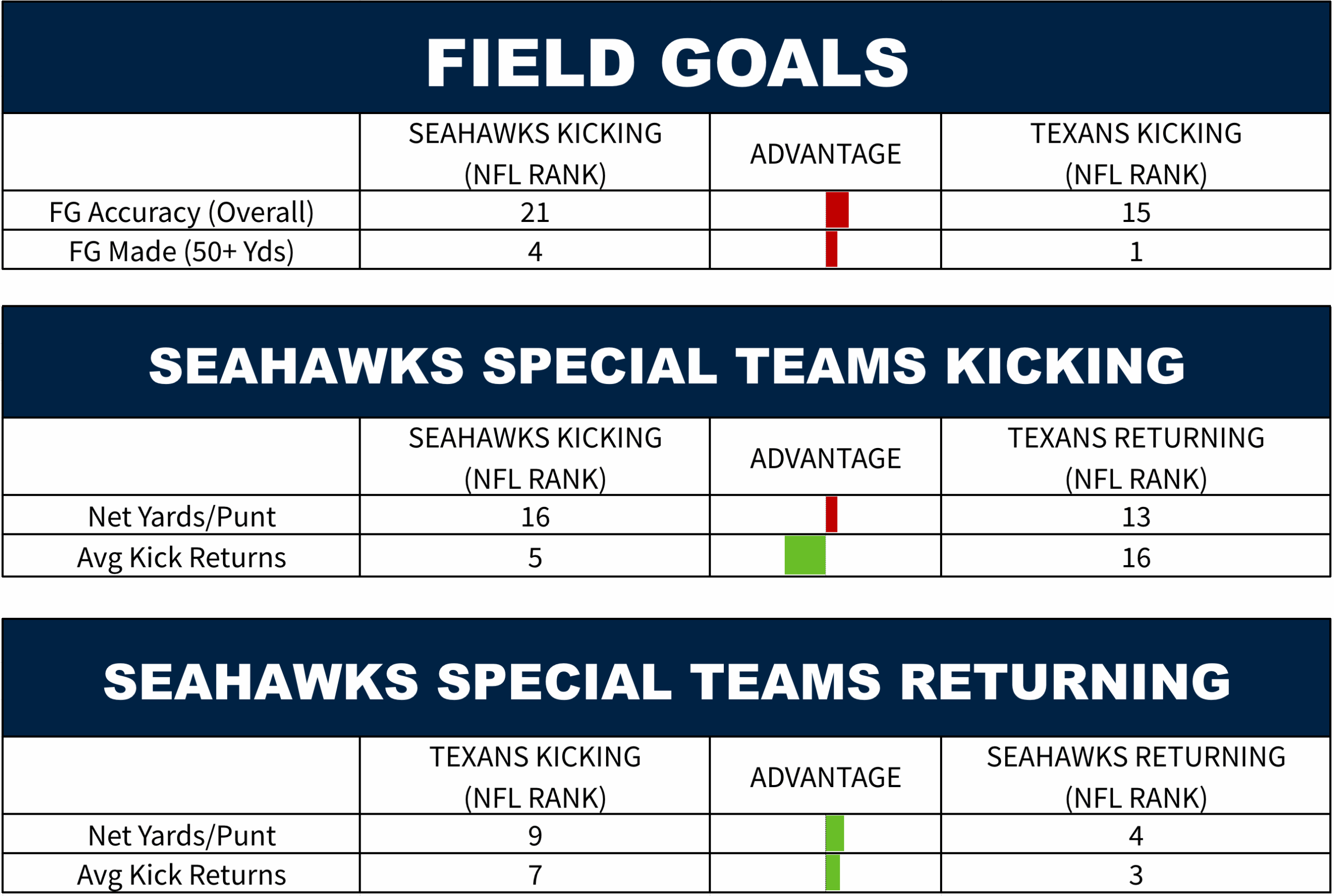 Expect a lot of fields in this game. Houston has kicked the most 50+ yarders in the league.