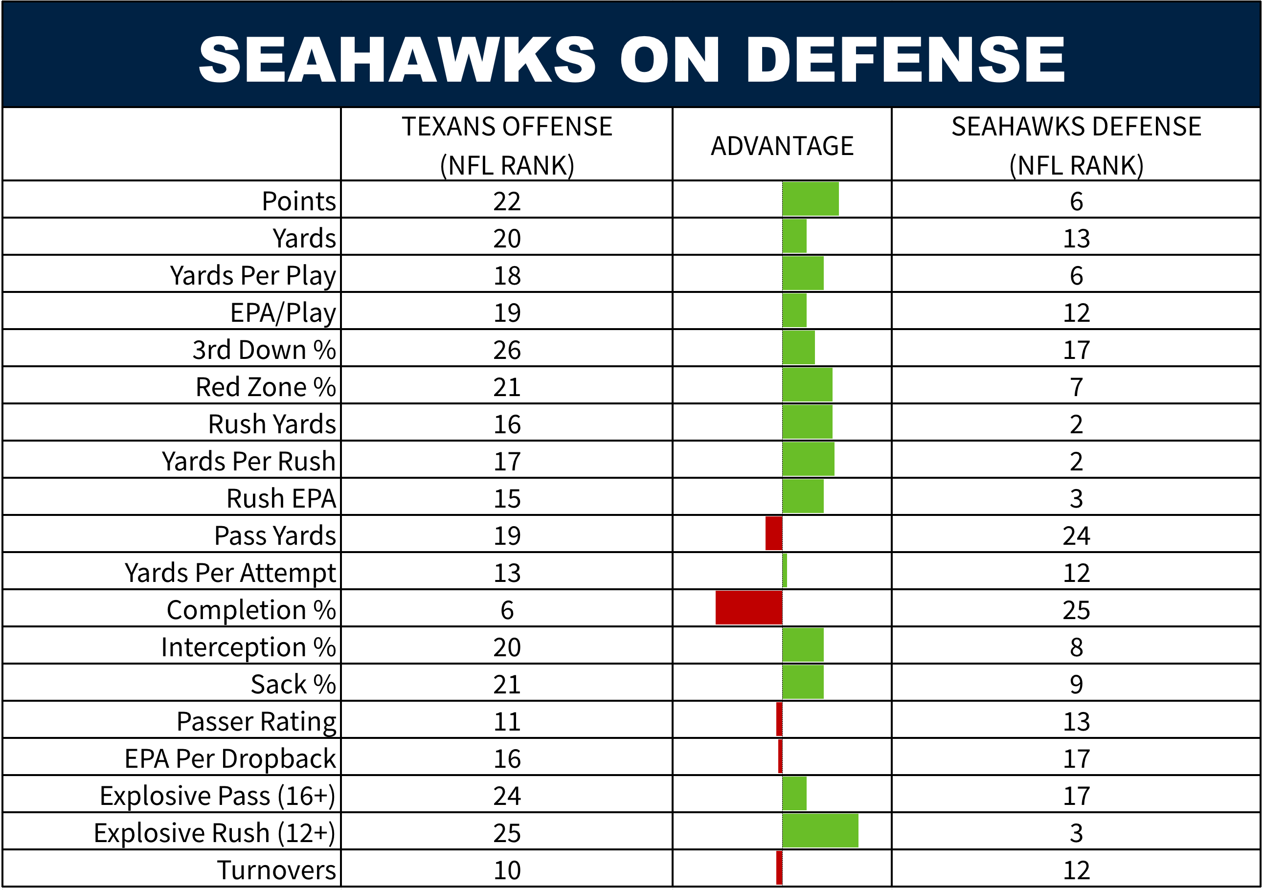 Seattle’s best chance to win will be if they can exploit the Texans weakness in defending the outside zone running game. That would reduce pressure on the pass game and pass protection and decrease the odds of a turnover. Short of that, the defense holding down the Texans offense and ideally getting a turnover or two should be enough.