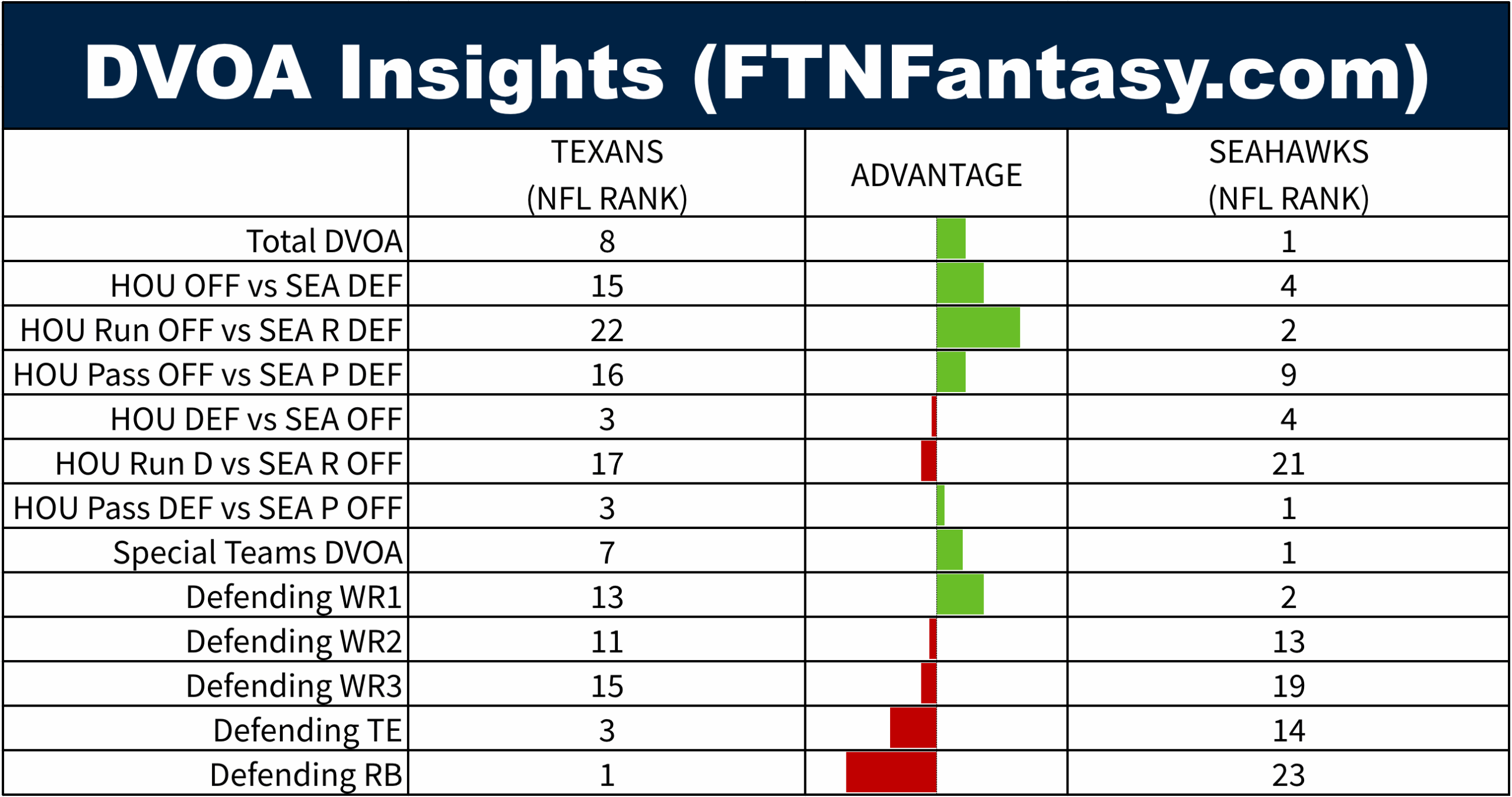 Tale of the Tape features DVOA data, courtesy of FTNFantasy.com. If you remember the great Football Outsiders site that used to publish DVOA rankings, you should know that data has moved to FTNFantasy. The table below shows how the two teams match up from a DVOA perspective.