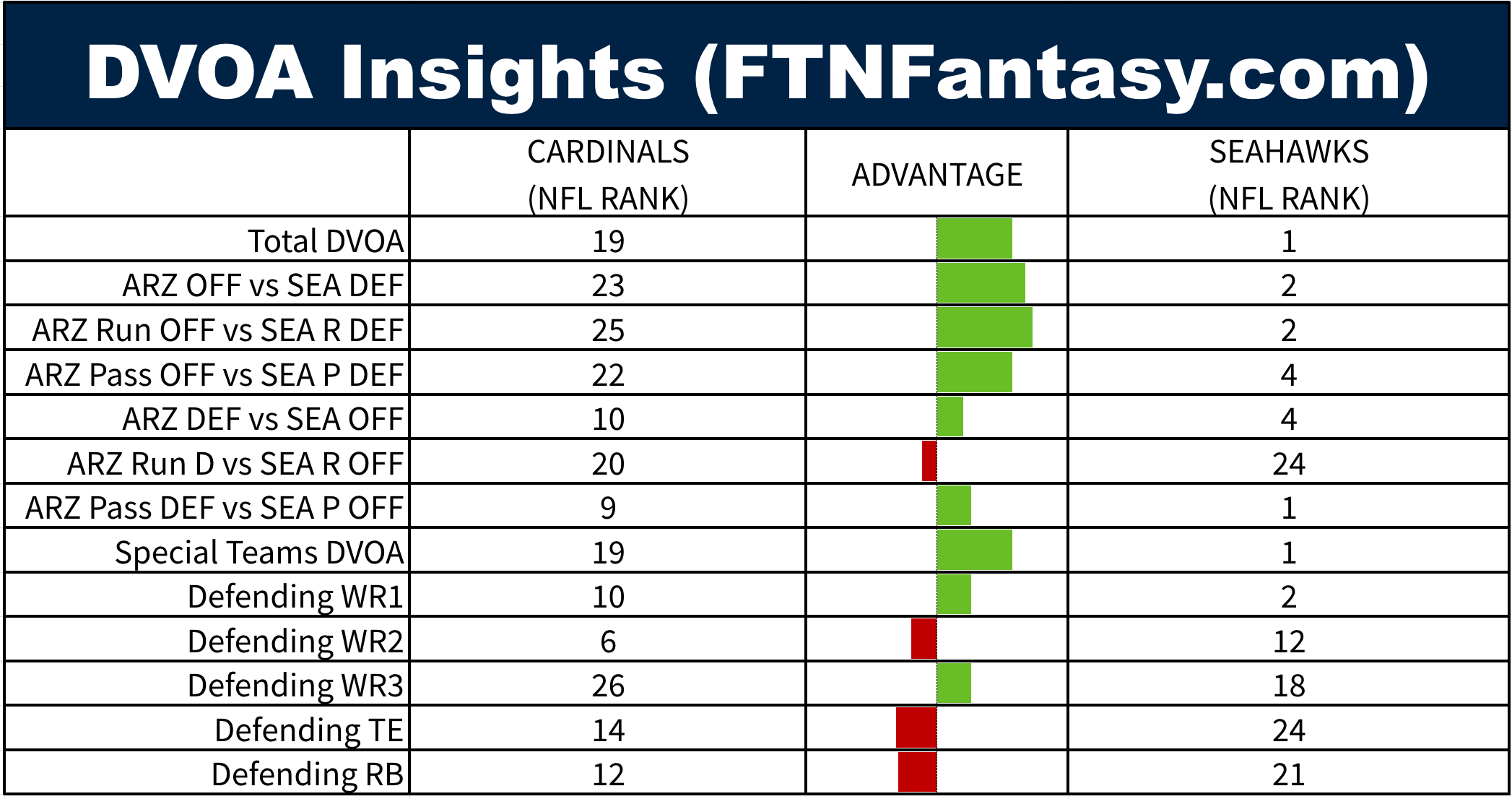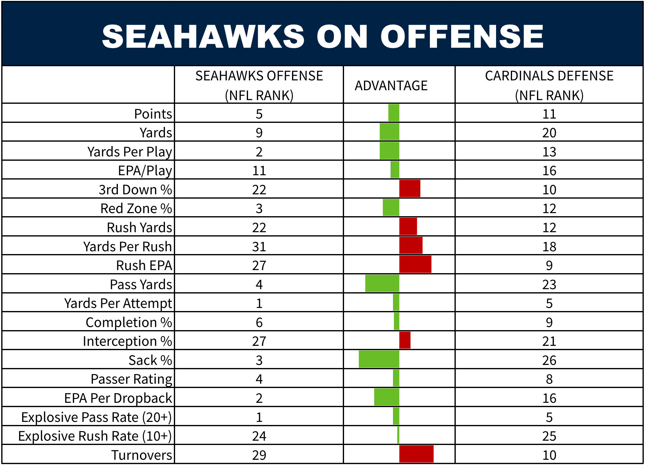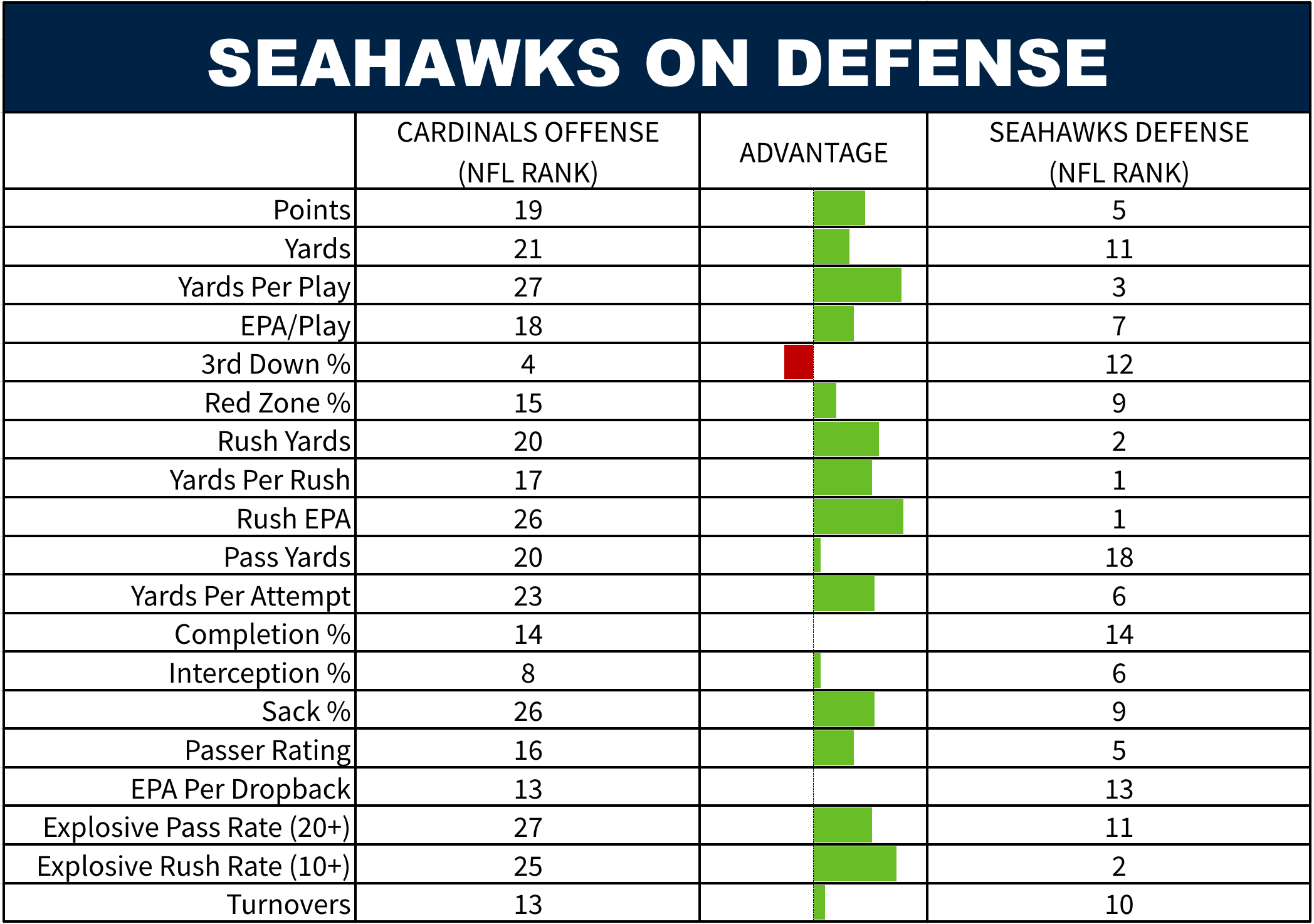 There are not a lot of clear advantages for this offense against the Seattle defense. One area could be 3rd downs. Arizona has done well in those situations and Seattle has been merely above average. Brissett has been excellent on that down, and the Cardinals rank as one of the best in the NFL in 3rd and long (7+ yards). Whereas the Seahawks rank in the middle of the pack in defending 3rd and long.