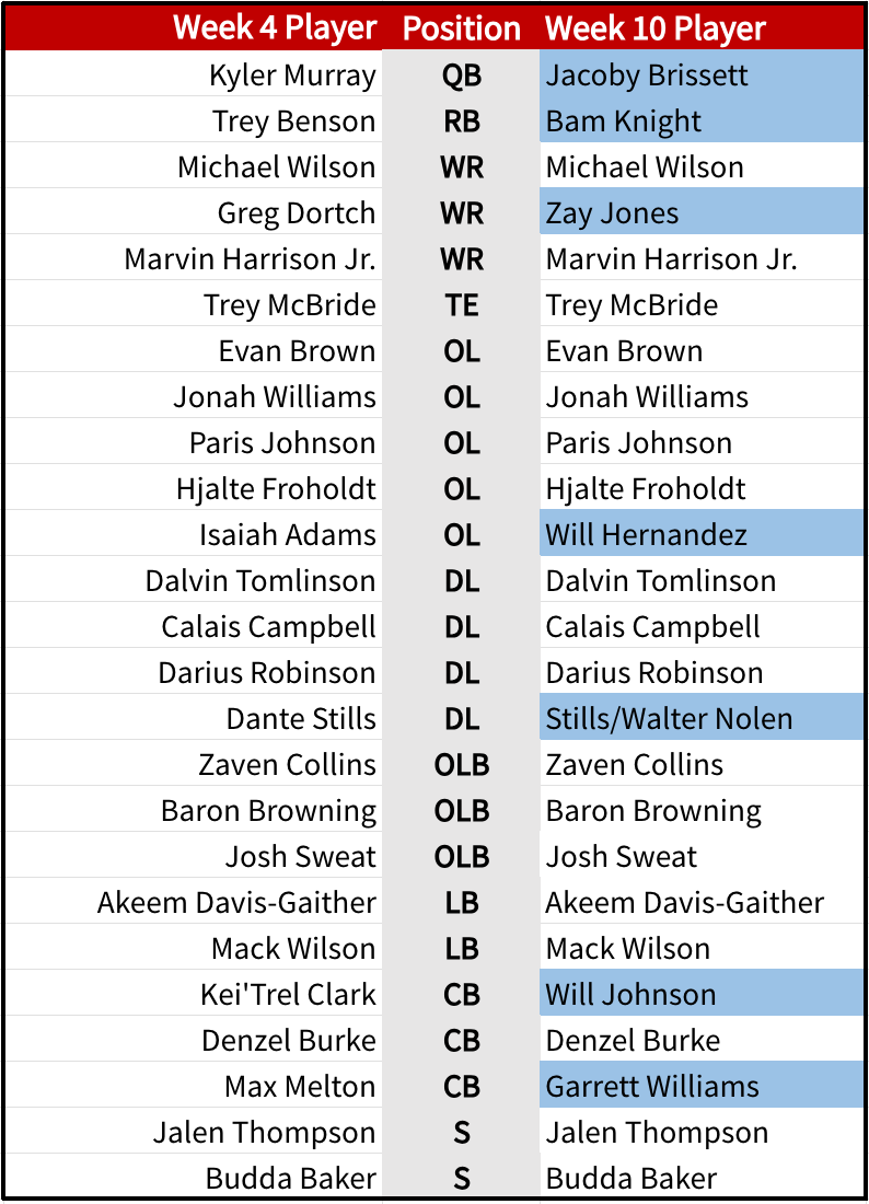 Many of these changes are steps forward for the Cardinals. Two injuries worth monitoring are for starting corner Max Melton (concussion) and starting linebacker, Mack Wilson Sr. (ribs) Neither participated in practice Wednesday. Rookie Cody Simon would step in for Wilson. Rookie Denzel Burke would take over for Melton.