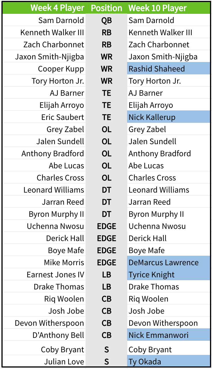 Having Rashid Shaheed available to step into the lineup is big as Cooper Kupp is still recovering from a hamstring injury and did not practice on Wednesday. DeMarcus Lawrence was injured in the first game between these two teams and only played 10 snaps. Ernest Jones did practice Wednesday, but it would not be a surprise if Tyrice Knight steps in, especially with the Rams game looming next week. The presence of Nick Emmanwori could be big in this one to matchup with Trey McBride.