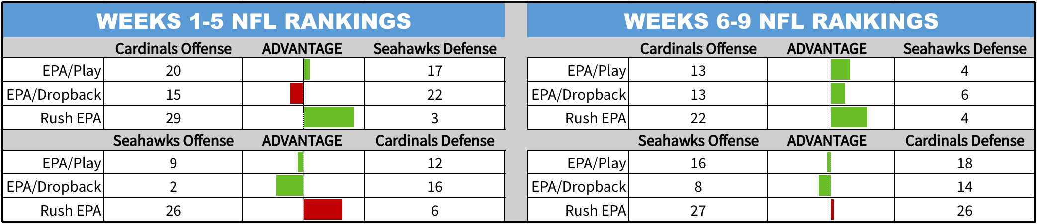 Given how different the Cardinals have been the last three games with Brissett at quarterback, it seemed useful to split up the pre-Brissett and post-Brissett performances. It is worth noting for the Seahawks portion that the game versus the Bucs happened in Week 5, so the offense was boosted by that game and the defense was sunk by it.