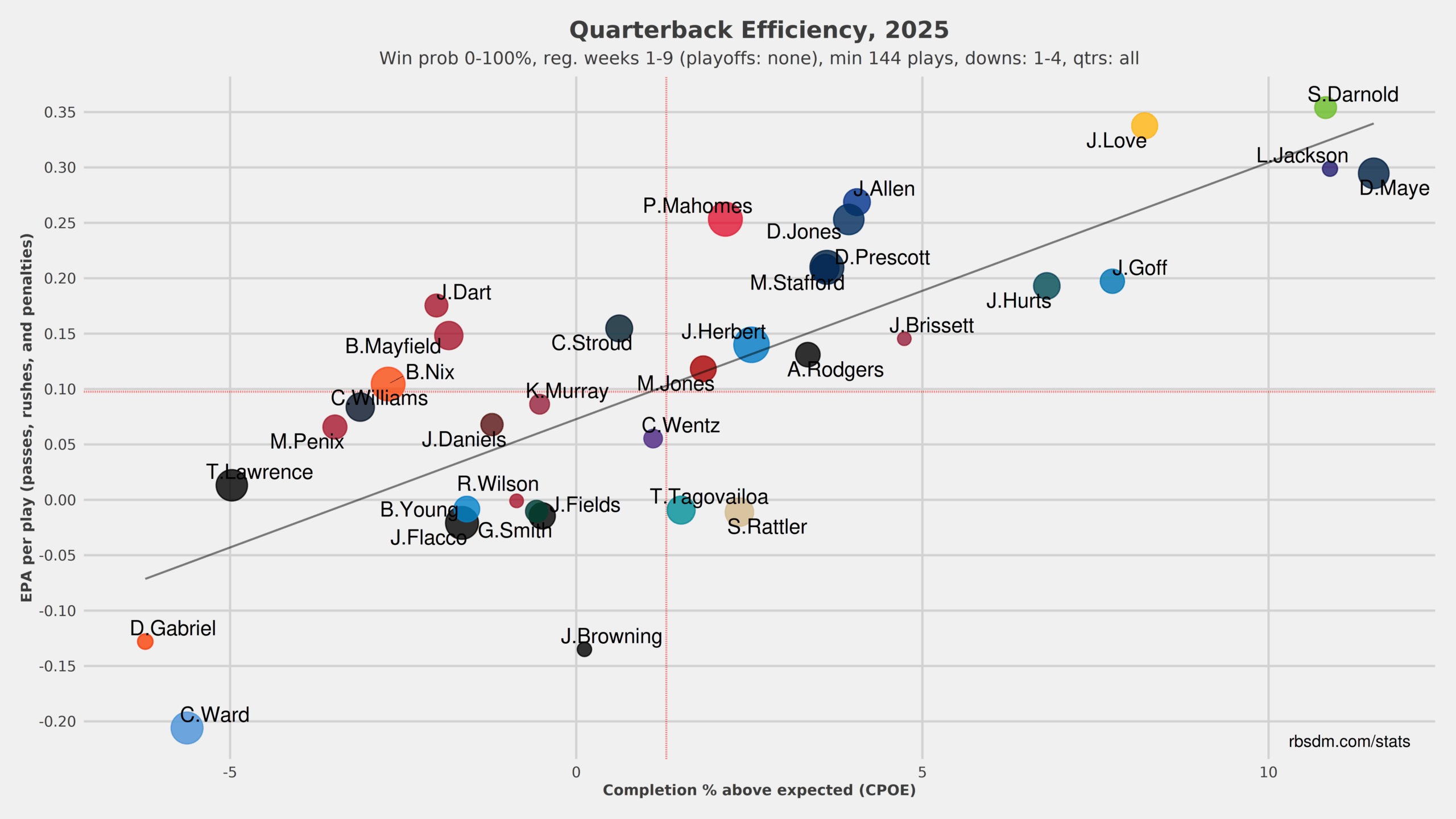 He has averaged almost two yards more per attempt (7.7 vs 6.0), and has been generating 66% more expected points (+3.26 EPA/game vs +1.96 EPA/game) than Murray. He has been especially good on 3rd downs, completing over 70% of this throws and posting a 129.4 rating.