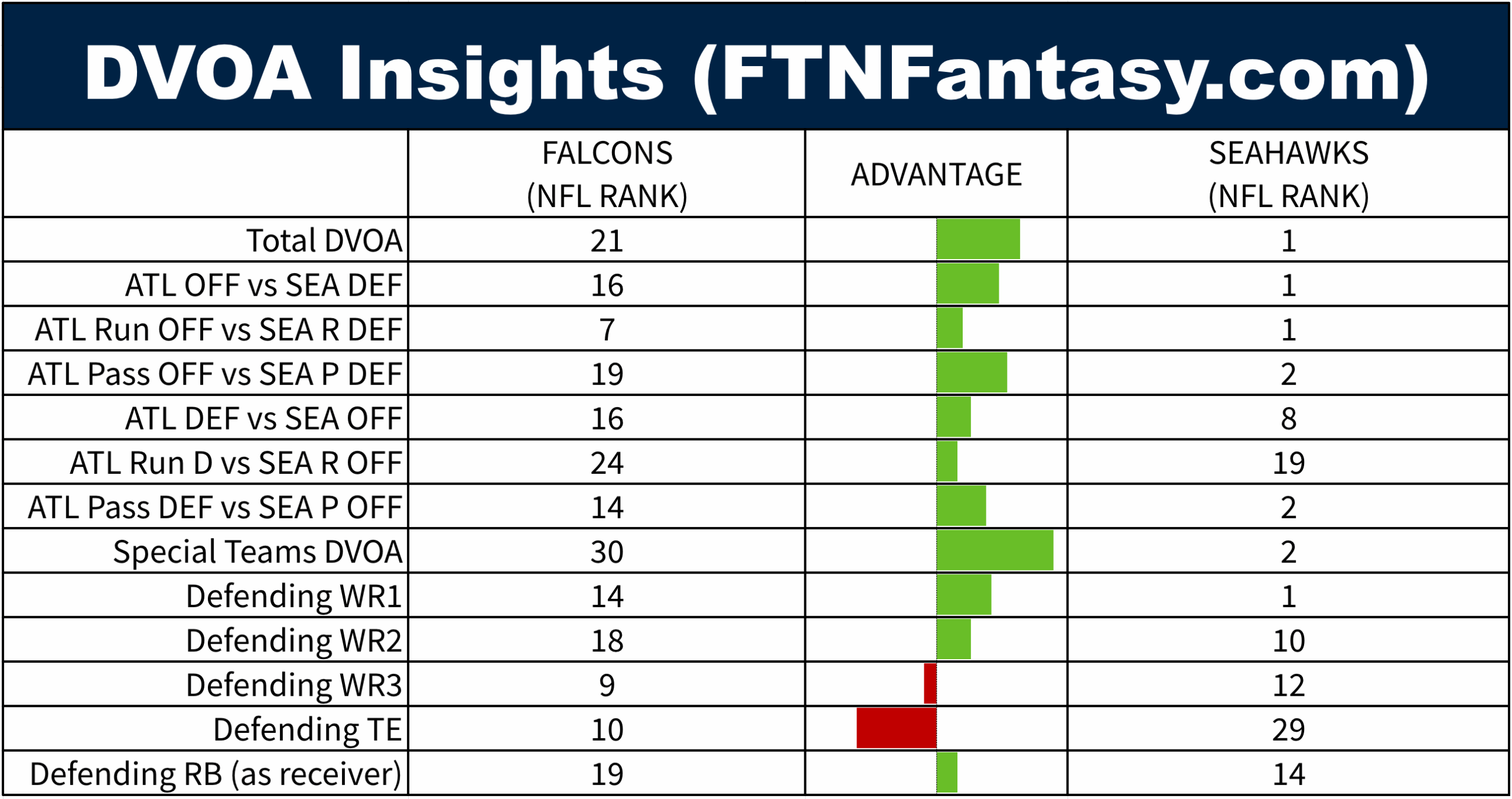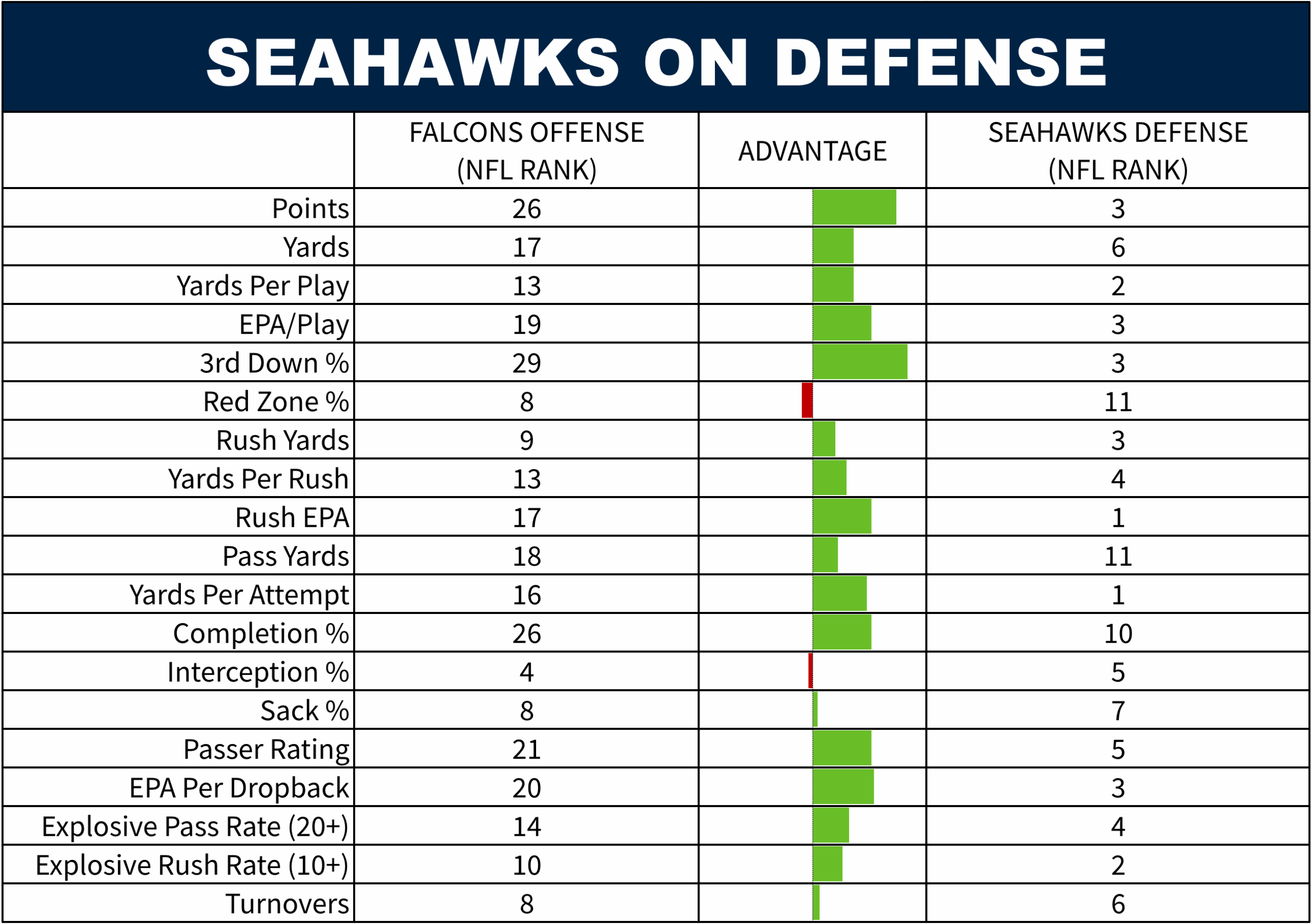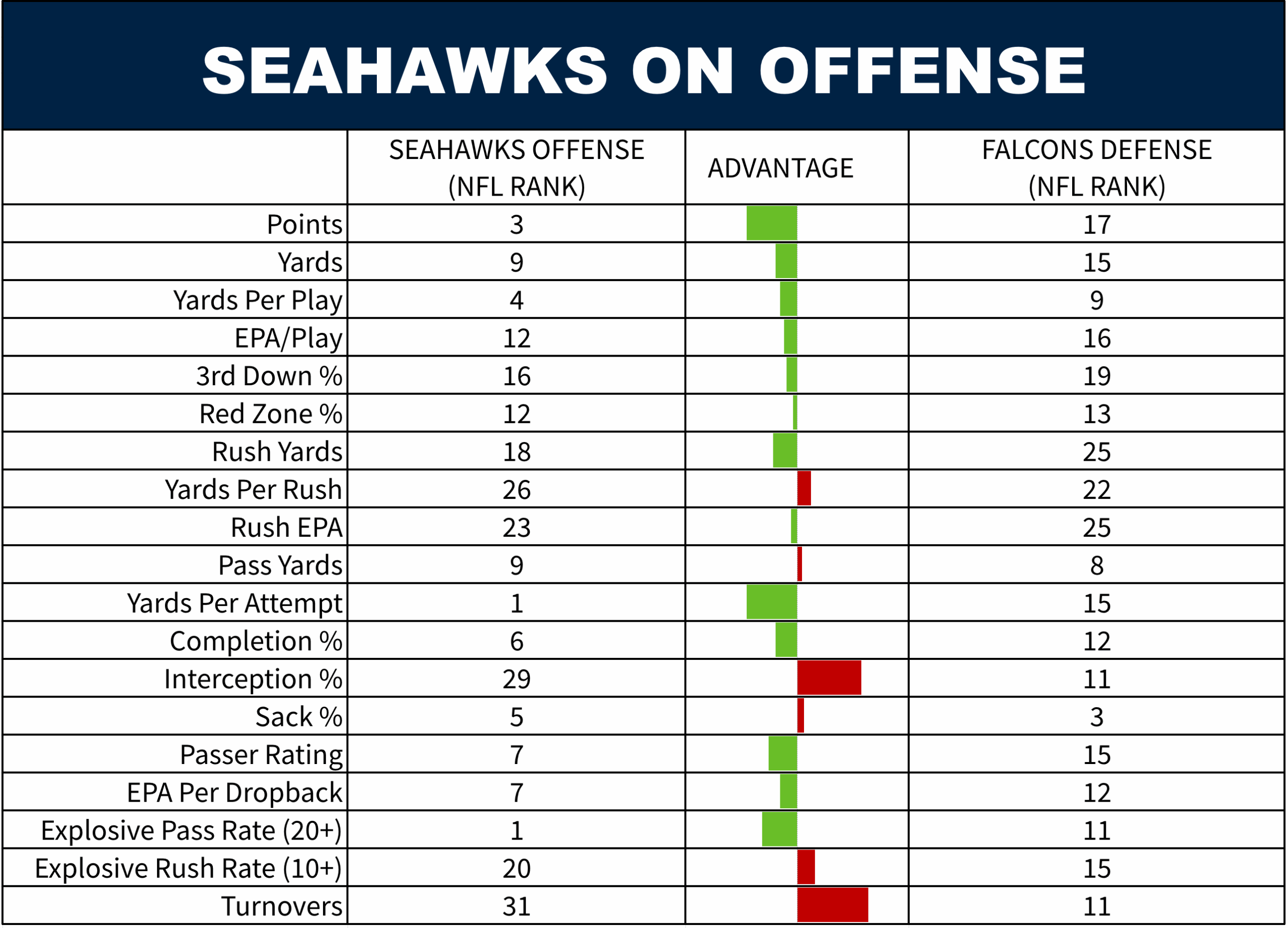 Atlanta is an underdog for a reason. Seattle has advantages everywhere, outside of how both defense fare against the TE position. Special teams has been a killer for Atlanta all year, including last week against the Jets.