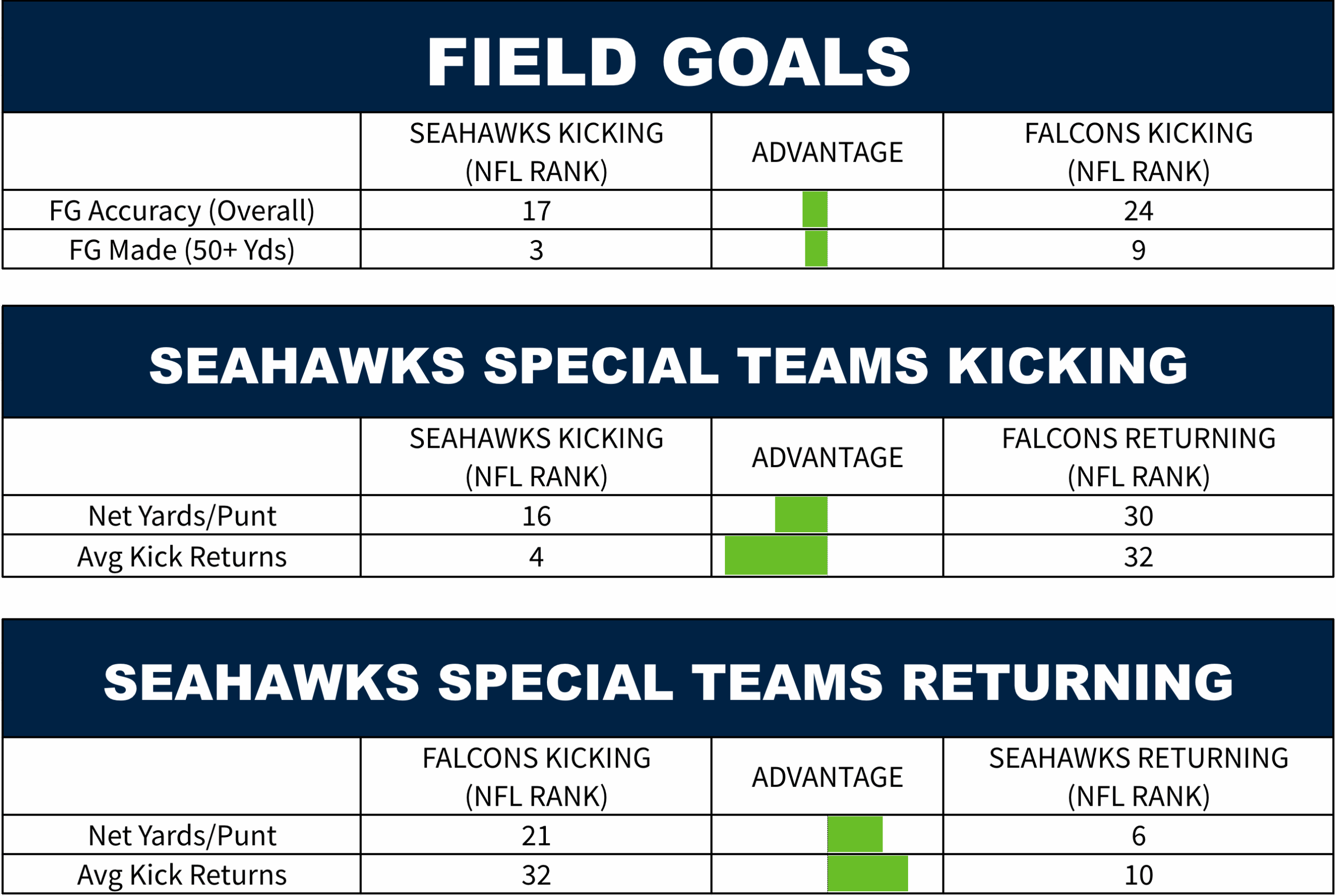 The Falcons almost impossibly rank dead last on covering opponent kickoffs and dead last in returning kickoffs. This is a bad special teams unit, one of the worst in the NFL. Seattle could break the game open with a special teams play.