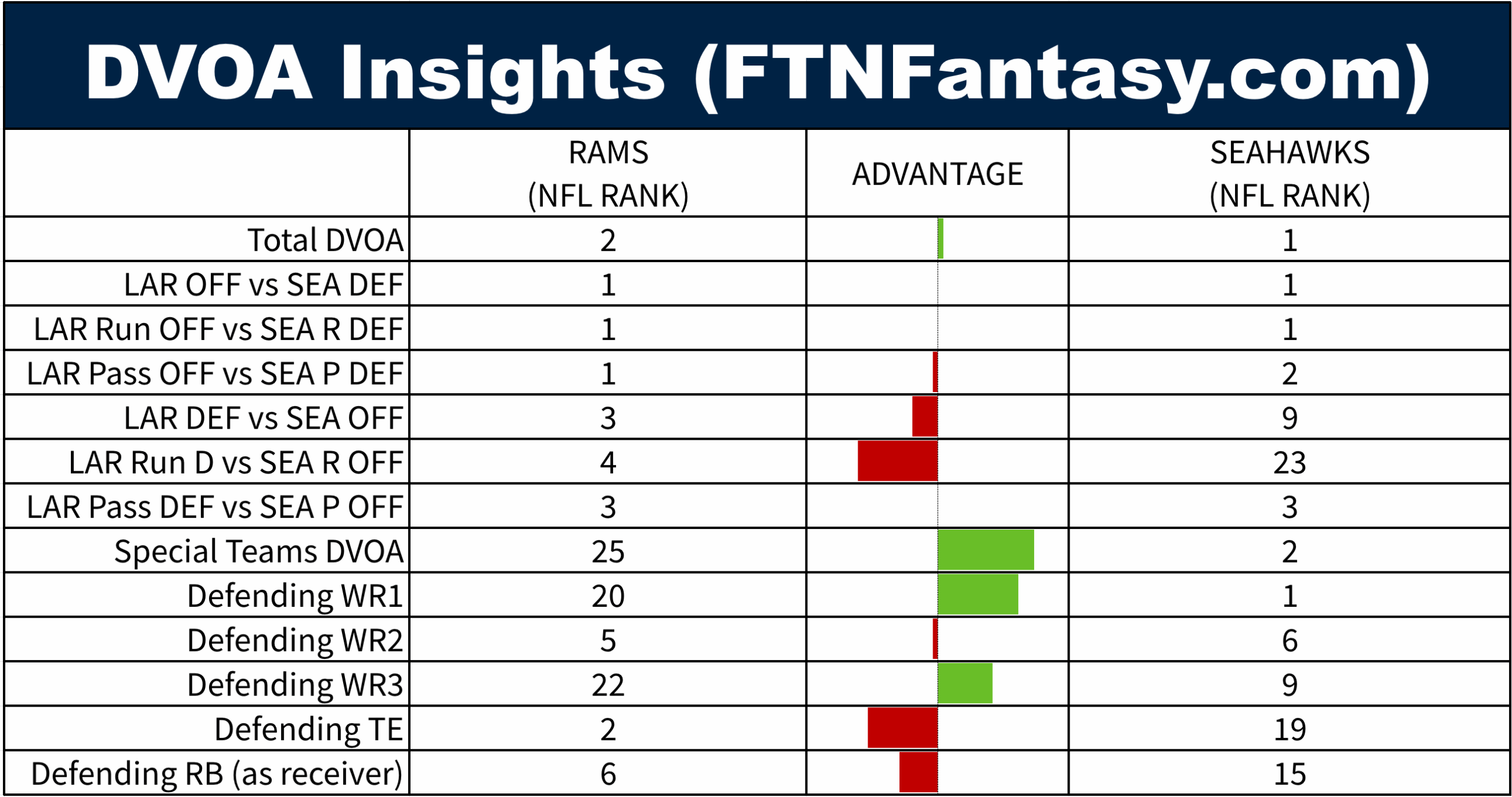 Tale of the Tape features DVOA data, courtesy of FTNFantasy.com. If you remember the great Football Outsiders site that used to publish DVOA rankings, you should know that data has moved to FTNFantasy. The table below shows how the two teams match up from a DVOA perspective.