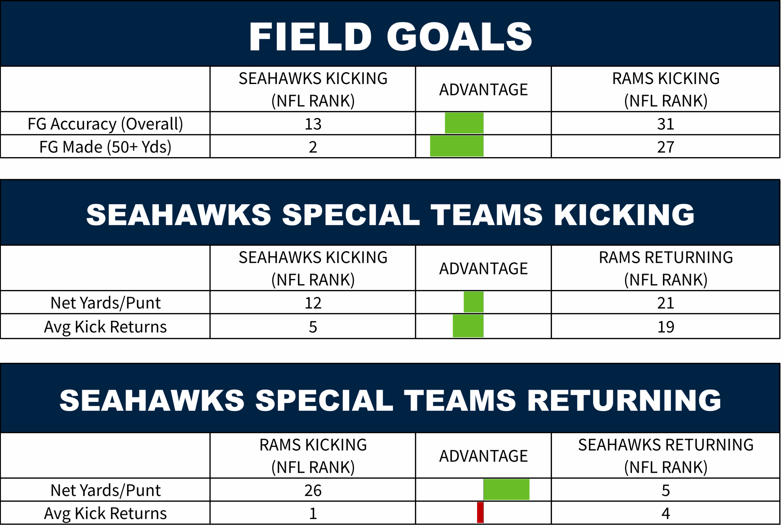The Rams special teams helped them win the first game with a key punt late. That unit has been a liability overall, while the Seahawks special teams has won them a number of games this season.