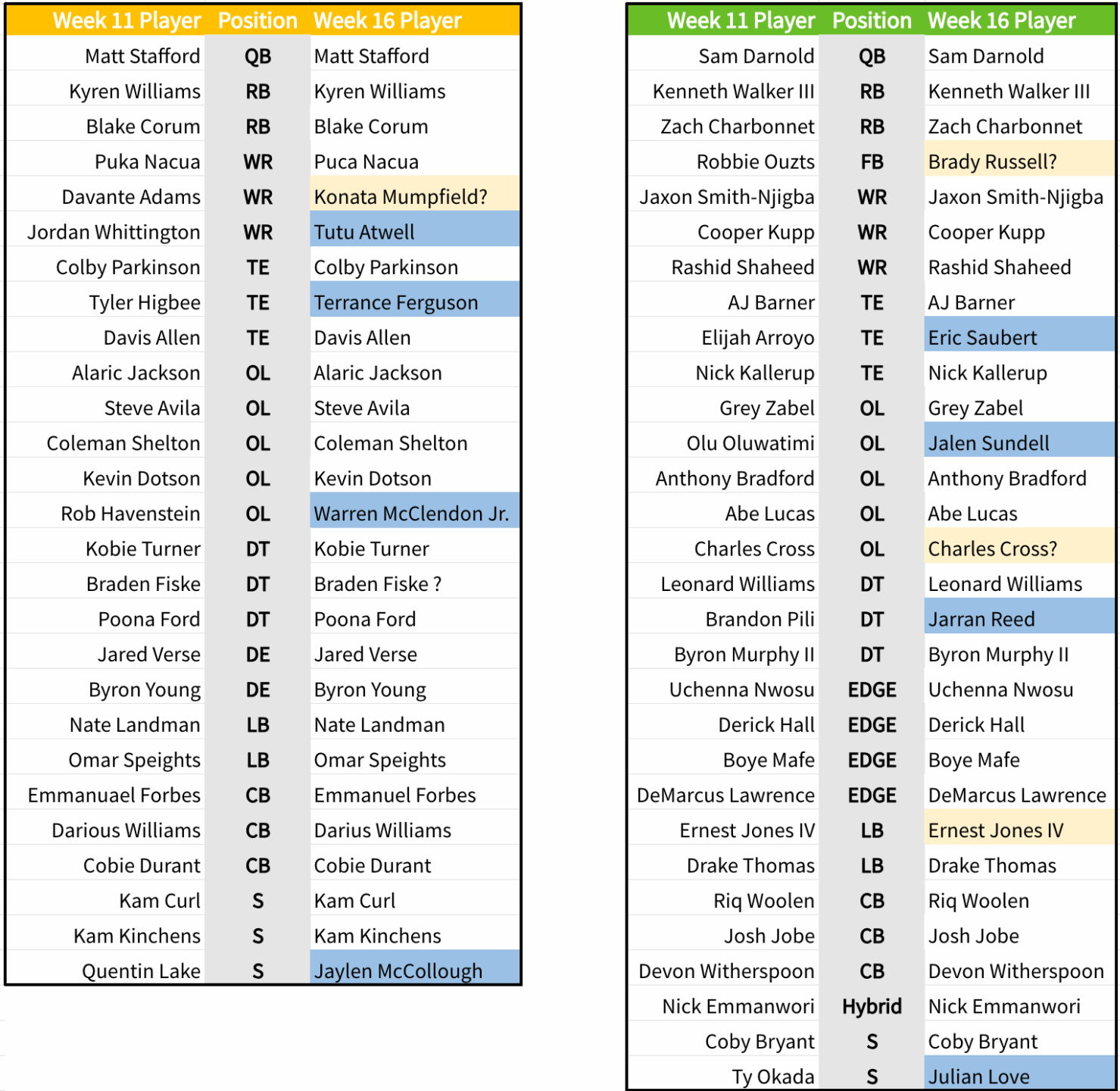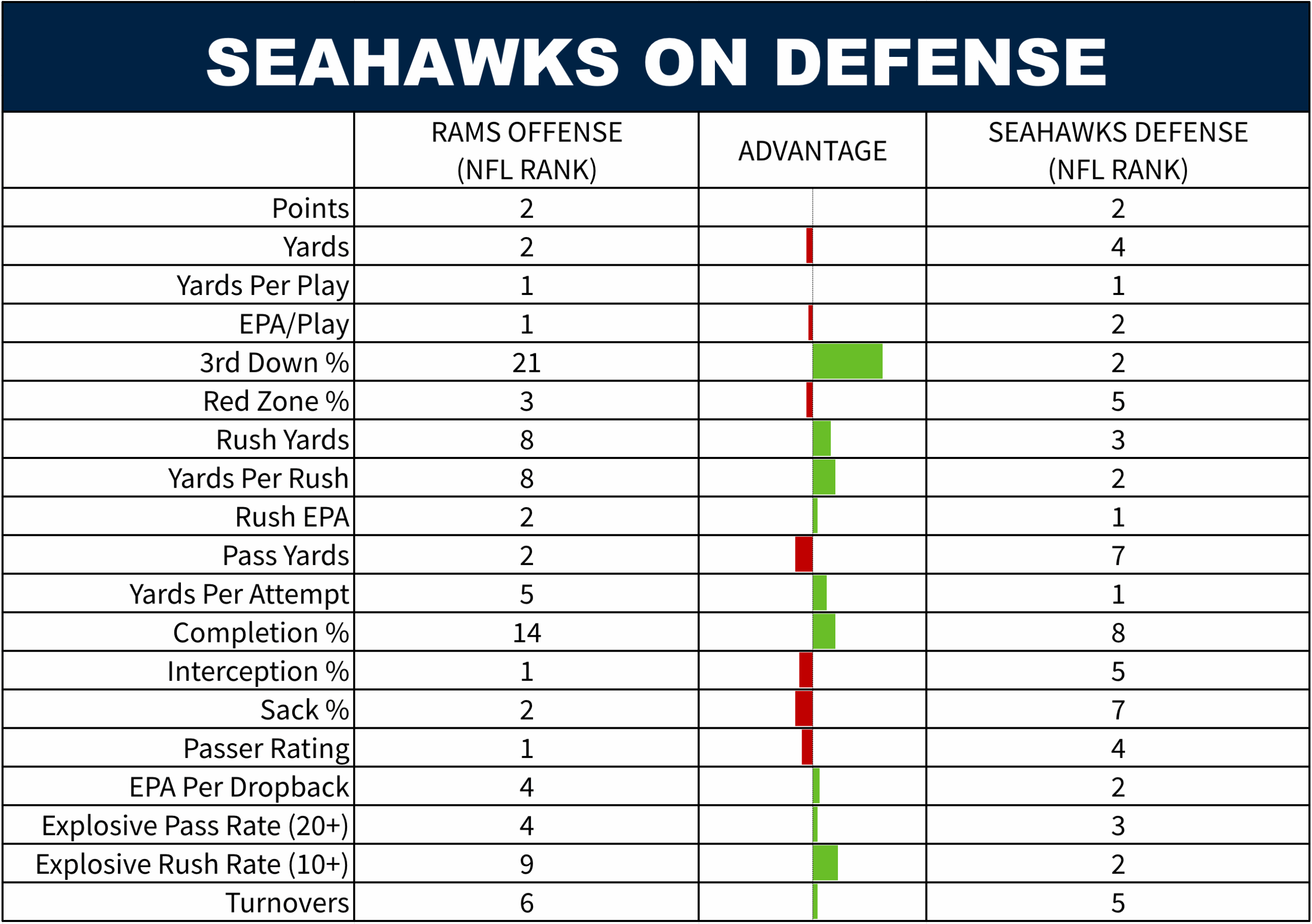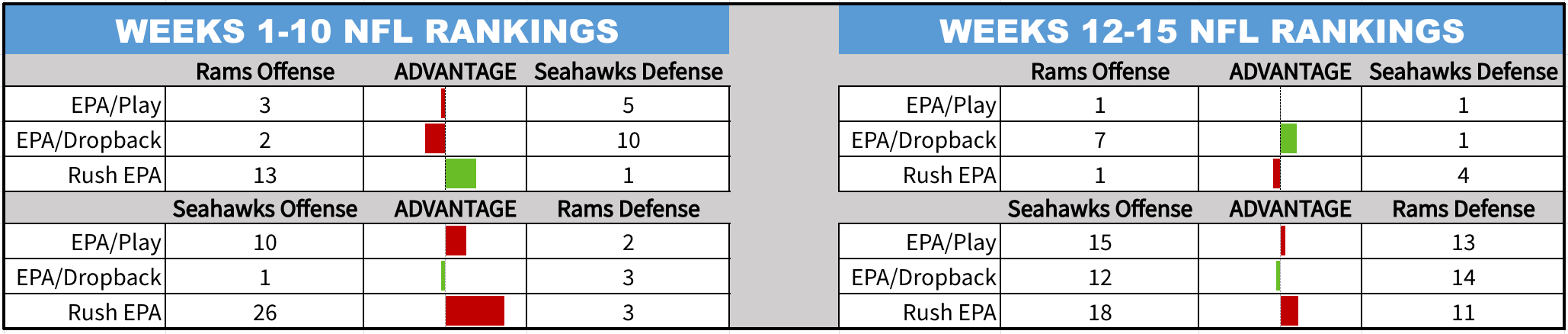 The table above compares how the Seahawks and Rams ranked in certain key efficiency metrics heading into the last game, and how they have both performed since. The actual Week 11 game is not included in either sample.
